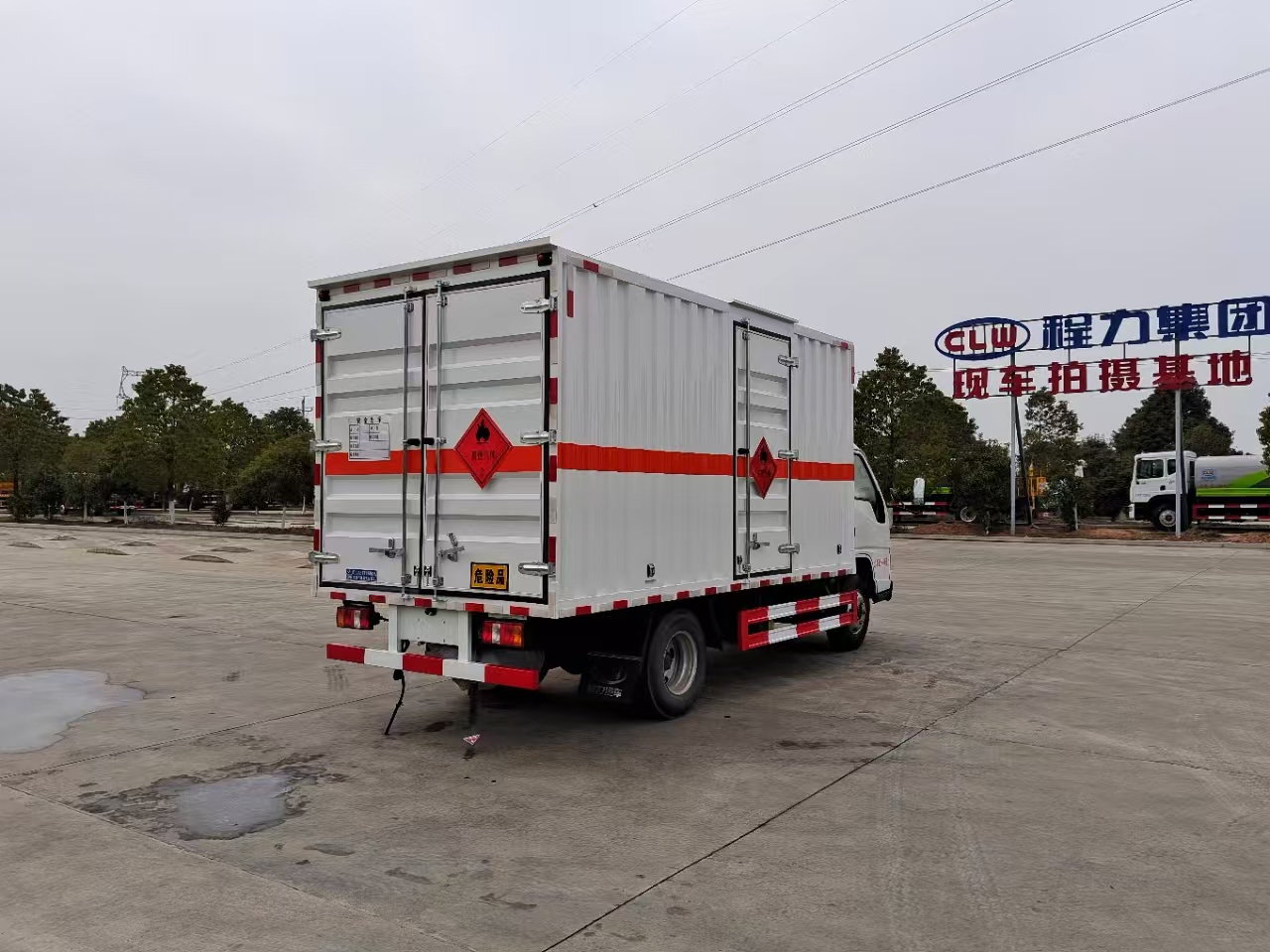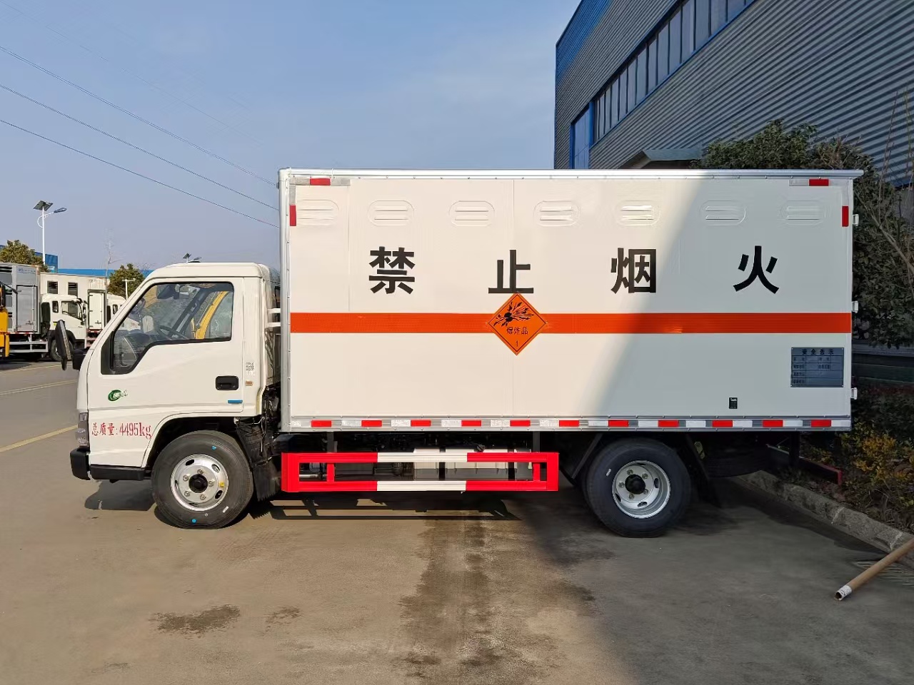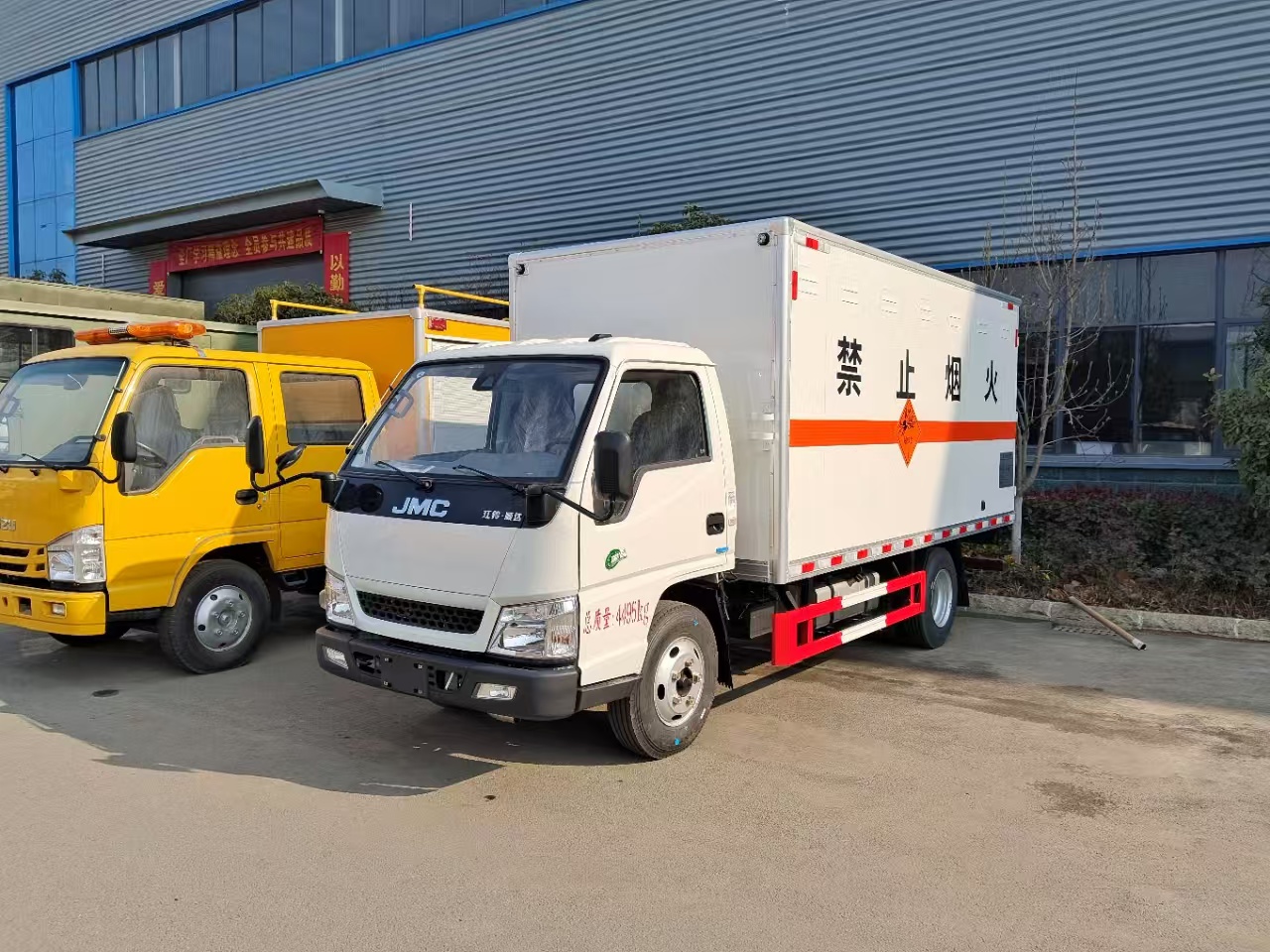 貨箱配置 廂體為雙層金屬骨架結構,外板采用冷軋鋼板,中間填充阻燃泡沫,內飾為鋁板。底板為平板上鋪防靜電膠皮。廂內兩側加裝固定貨物臥環,門框帶防盜報警器,頂部帶煙霧報警器,廂體右側選裝側門,隨車配2個滅火器,危險標志牌,防火帽,危險品三角頂燈。