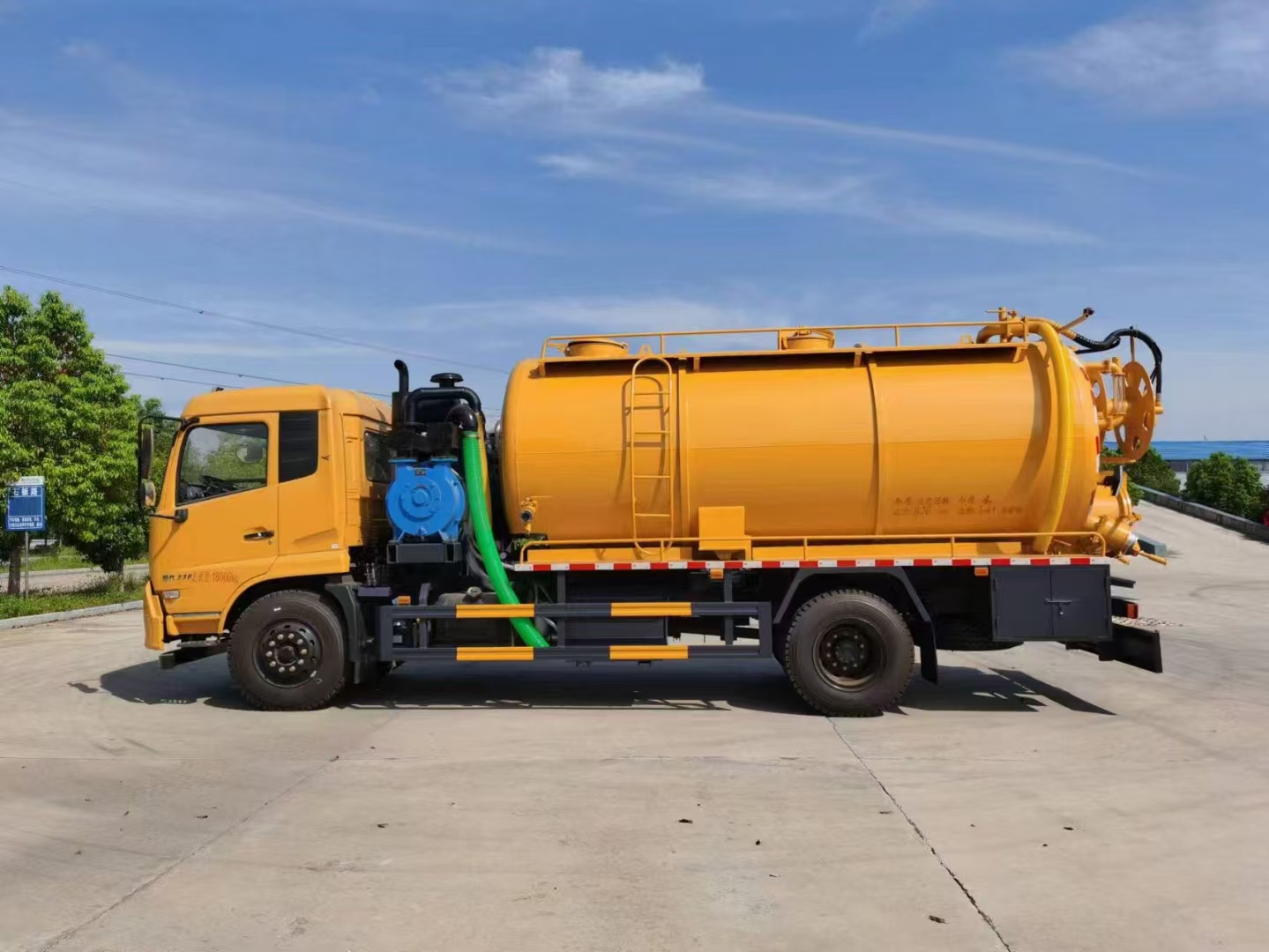 上裝配置 罐體容積15立方左右,清水罐5立方,其余為污水,罐體8mm厚,封頭8mm厚,舉升頂為自卸中置頂,副駕駛一側清水罐和污水罐用DN100球閥互通,另罐頂裝一個互通,副駕駛一側按照公告圖片安裝爬梯;清水罐:品孚350高壓泵,罐頂水車罐口一個,帶爬梯,高壓管100米22號高壓管,尾部液壓卷盤,左右各裝一個消防栓進水口,清水罐裝兩側各一個小球閥,罐底裝一個DN65排水閥, 吸污罐:一個散水罐口,罐體內部鋪1.2米不銹鋼板,罐內爬梯,罐體內部防浪板加固,水循環泵水箱為碳鋼材質.副發濰柴375馬力配SK-30水循環泵,副駕側排150鋁合金球閥,開600小蓋排污口,尾部600小蓋左側一個150排污口,右側一個100的進料口,側邊一個100排清水,罐體尾部兩側工具箱,1根10米吸污管,箭頭燈,手動油門…