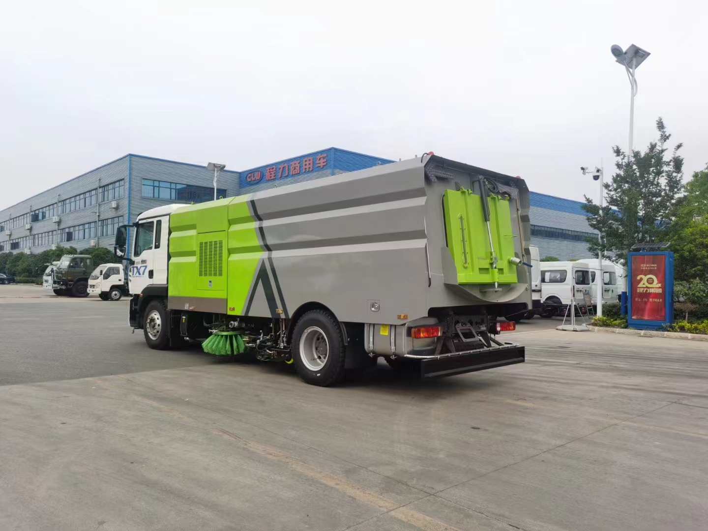 上裝配置 副發康機170馬力,廈門南超免維護自動離合器,免維護風機,海德瑞沃電磁閥組,德國進口高壓泵,萬向高壓路沿清洗,耐磨液壓油缸,西門子電控開關,左右、后噴霧壓塵系統,不銹鋼垃圾箱及碳鋼水箱電泳防銹處理,水箱容積9立方左右,垃圾箱容積7立方左右,最大清寬度3.5米,前置兩掃盤,中置吸盤,手動泵應急系統,多種語音報警尾部箭頭燈。 隨車配備低壓沖洗前沖后灑及高壓沖洗功能(前路沿沖洗/中沖/20米高壓沖洗卷盤/后噴霧/垃圾箱自潔)尾部箭頭作業燈。