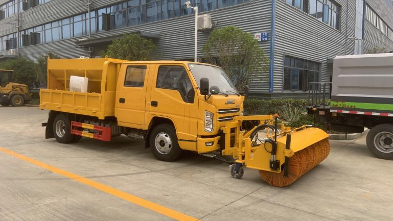 上裝配置 箱體尺寸2600*2060*400mm,箱體內裝 3立方融雪撒布機,撒布機采用 V 型料倉,結構簡單可靠,使融雪劑自動落料,出料完全,無殘留。駕駛室可加裝2米除雪鏟或者2米除雪滾。